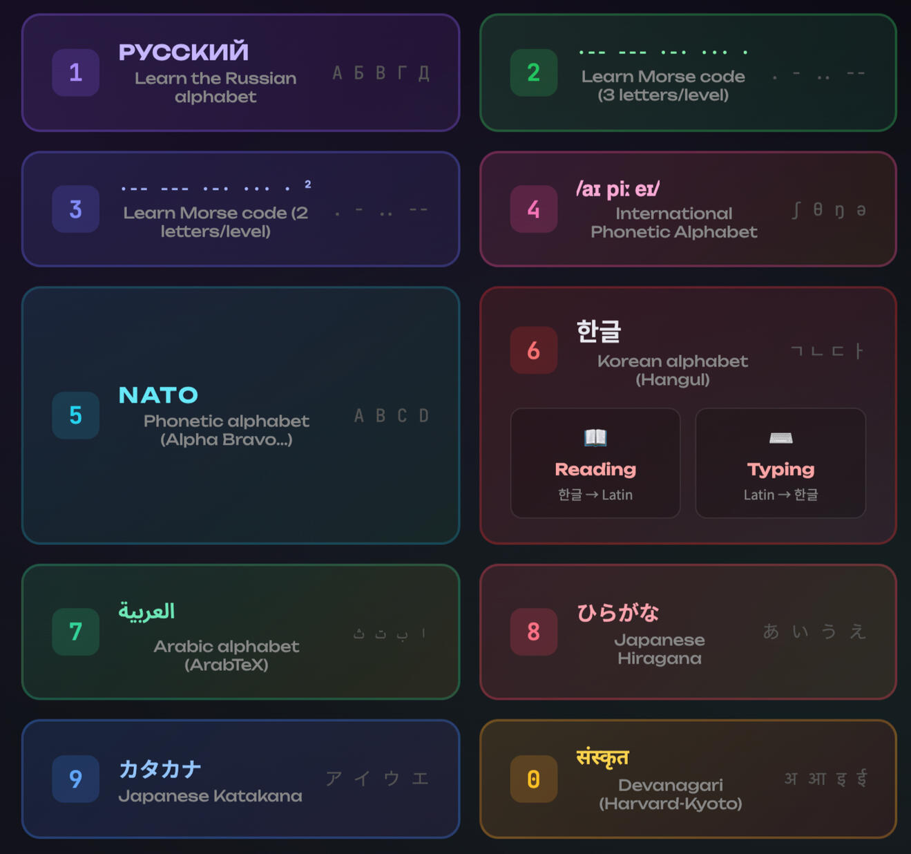 Through fast-paced practice, drill a new alphabet into your memory in as little as an hour.It's more than passive recollection.You'll be able to quickly read new words and sentences, in a new language!
